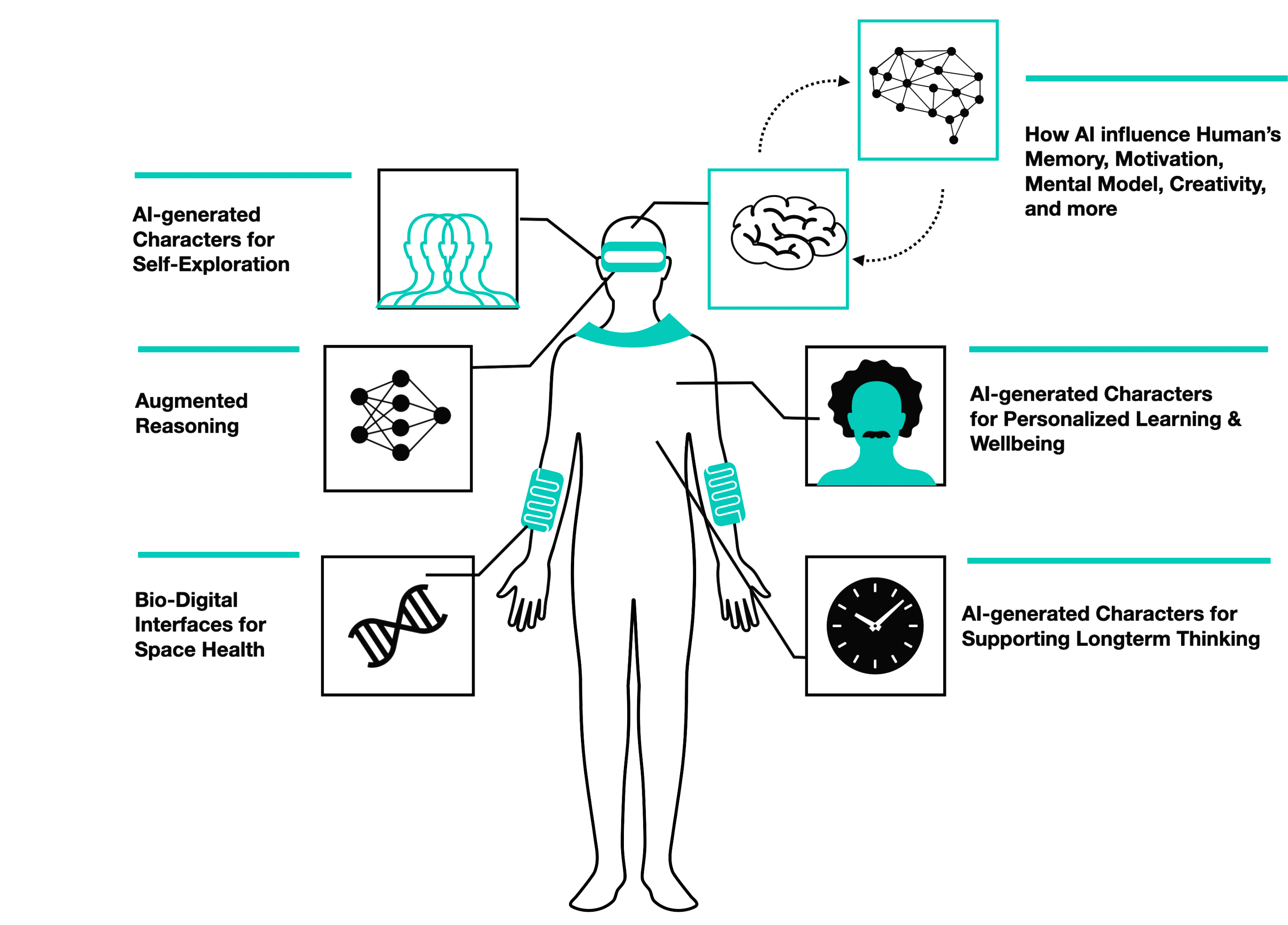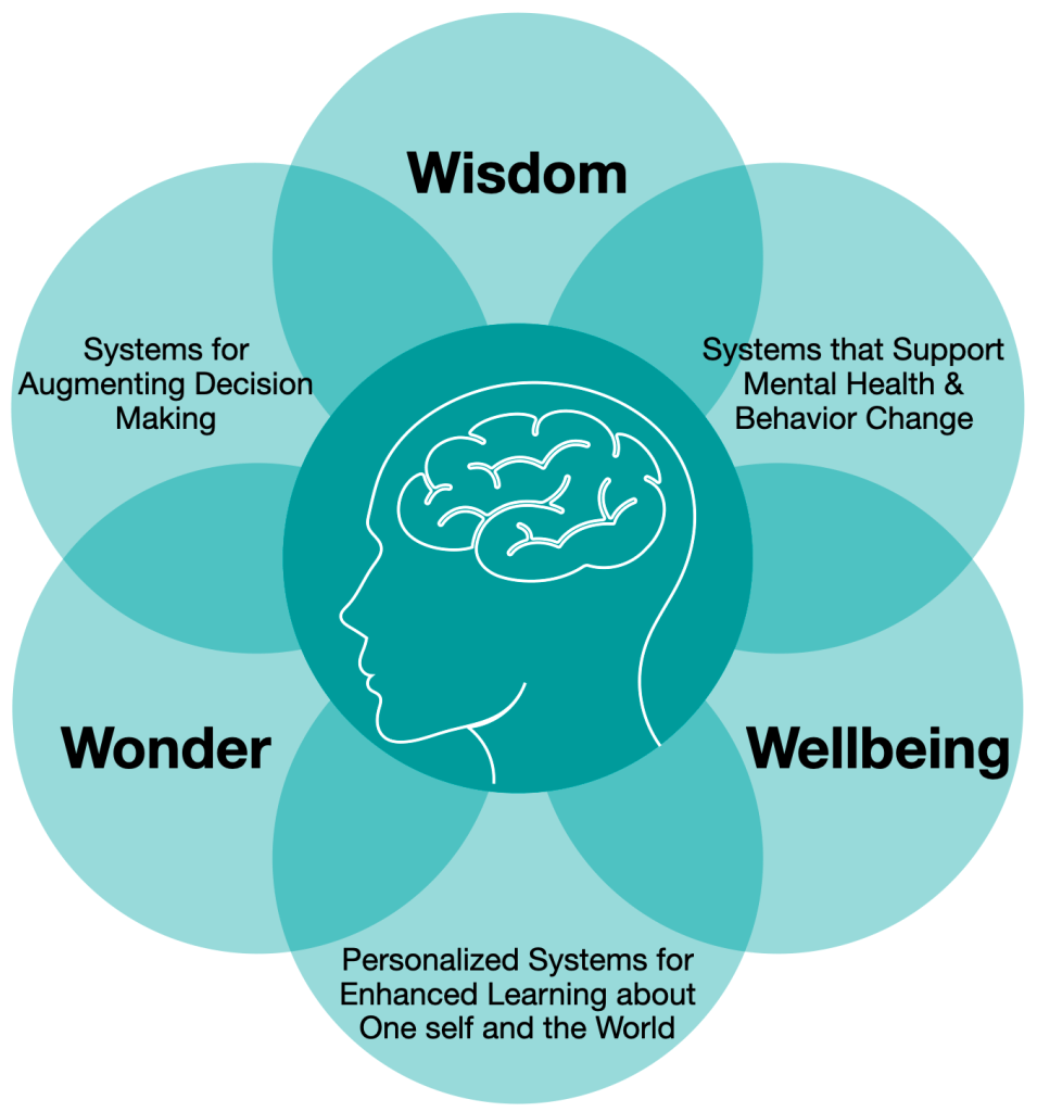 Building on these insights, I then developed and evaluated novel technical implementations supporting three key areas of human development: wisdom cultivation, wonder nurturing, and well-being prioritization. This included “Future You,” a conversational AI system using LLMs and StyleGAN to create personalized future self-interactions that demonstrated significant benefits for anxiety and motivation across 188 participants and reached over 60,000 users globally (published in IEEE Frontiers in Education 2024 and NeurIPS Creative AI 2024), as well as the “Wearable Reasoner” system that achieved 85% accuracy in real-time argument analysis (ACM Augmented Humans 2022) and evolved into an AI Socratic mentor shown to enhance critical thinking capabilities (ACM CHI 2024).